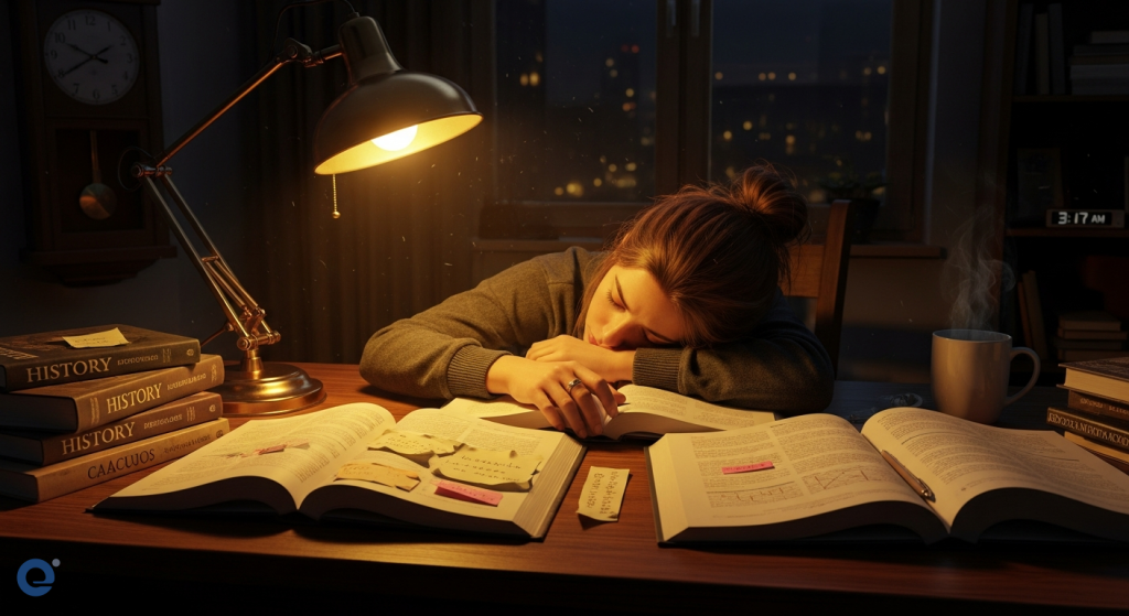 A tired student slumps over a desk, surrounded by textbooks, while a clock shows late at night.
