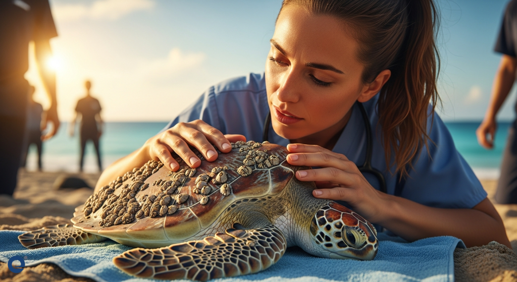 A dedicated wildlife veterinarian carefully examines a rescued sea turtle, preparing to administer life-saving treatment.