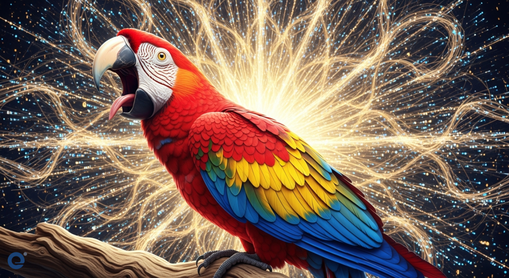 A detailed illustration of a parrot with its beak open, seemingly mid-sentence, surrounded by intricate patterns representing sound waves and data points.