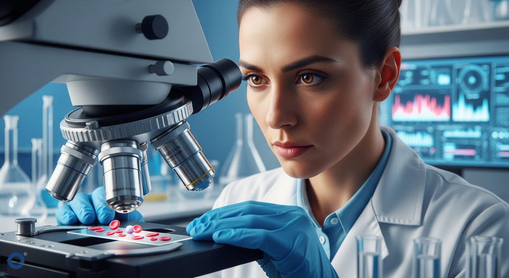 A laboratory scientist carefully examines a blood sample under a microscope, searching for subtle cellular changes that could indicate an autoimmune response.