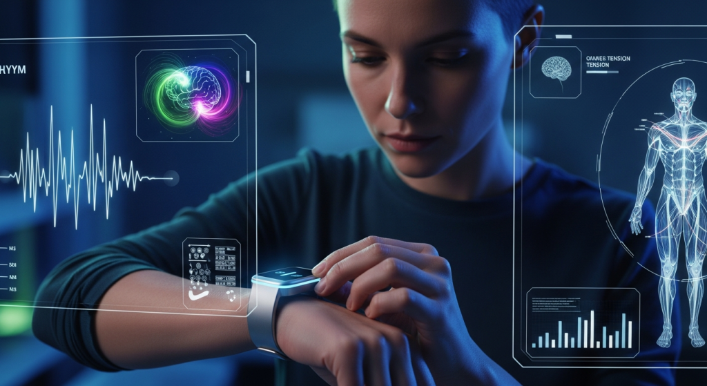 A person meticulously calibrating a wearable device, surrounded by data visualizations of their own biological metrics.