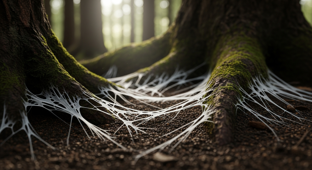 Delicate white threads of mycelium weave through dark, rich soil, connecting the roots of ancient trees.