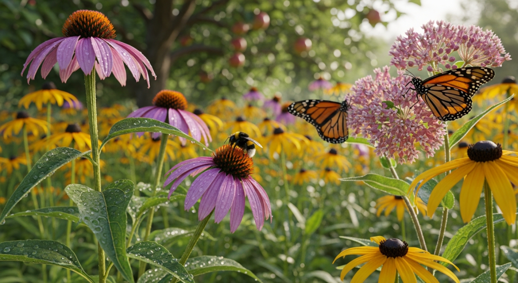 A vibrant garden teeming with native flowers, buzzing bees, and fluttering butterflies, showcasing a harmonious ecosystem.