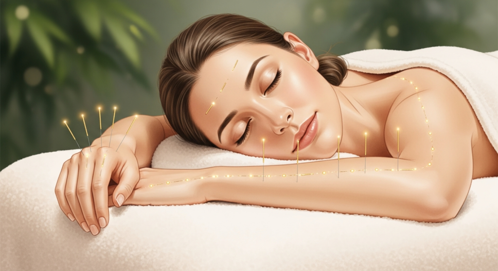 A serene illustration of a person receiving acupuncture, with gentle needles symbolizing therapeutic release.