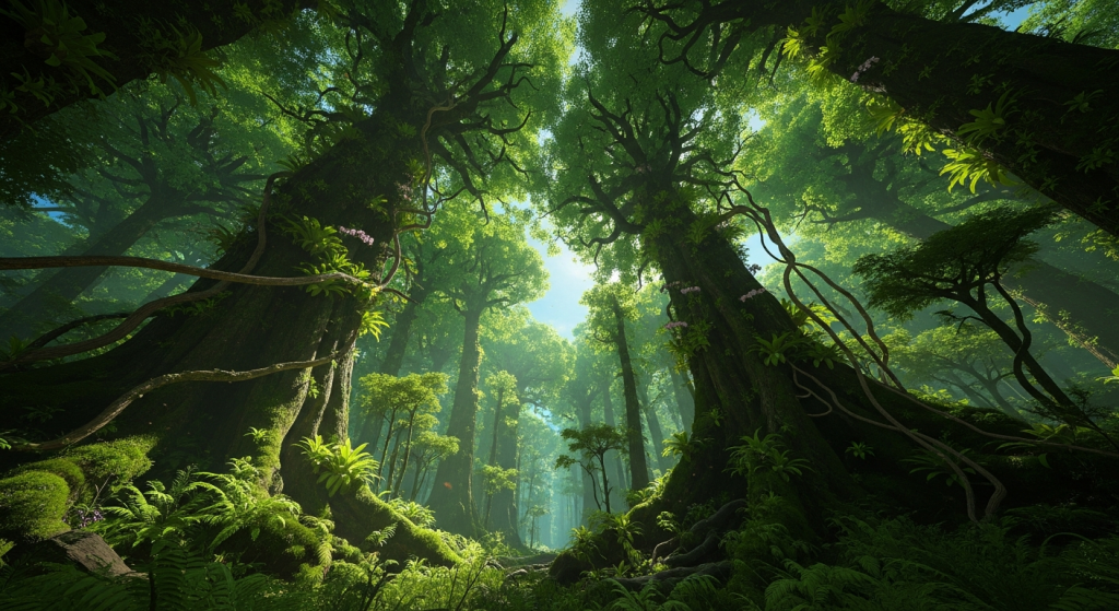 Vast green canopies stretch towards the sky, teeming with unseen life.