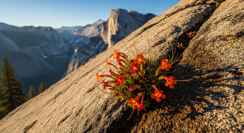 Tiny monkeyflowers bravely colonize a harsh, rocky Yosemite landscape.