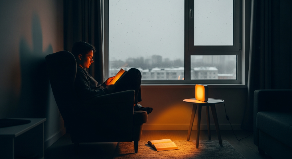 A person sits by a window, bathed in the warm glow of a light therapy lamp during a dim winter morning.
