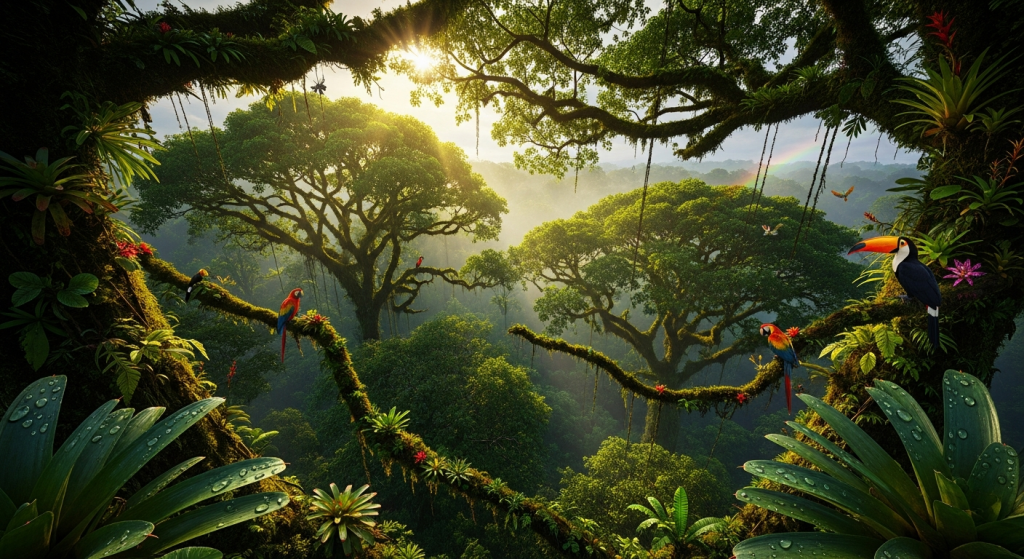 A vibrant rainforest canopy, alive with mist, symbolizing the vital role of trees in generating atmospheric moisture and rainfall.