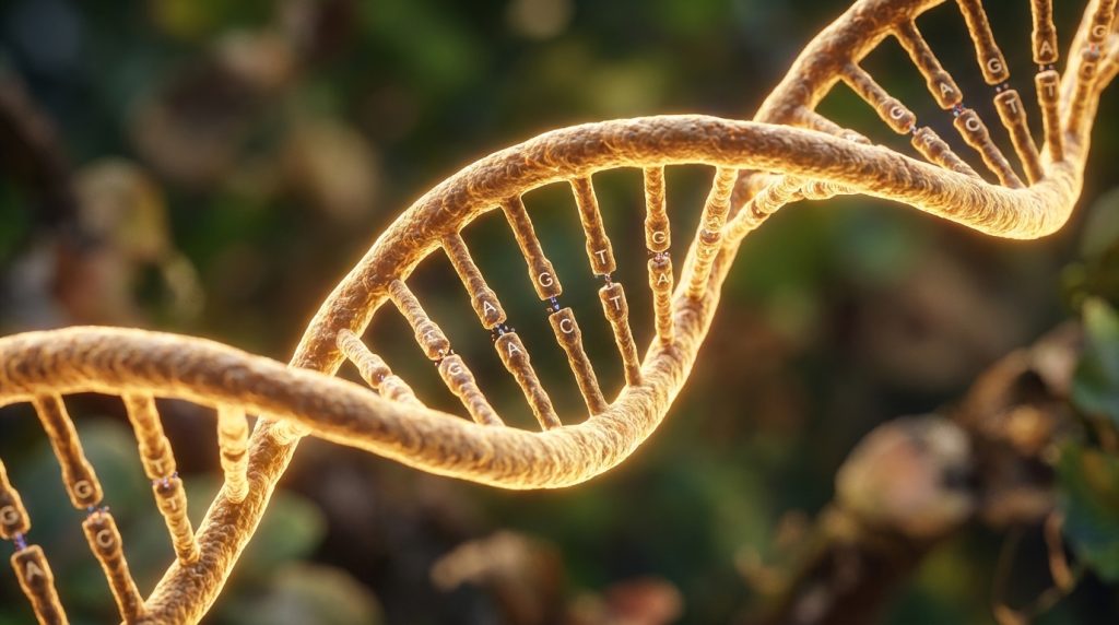 A stylized illustration of a DNA helix intertwined with vibrant fruits and vegetables, symbolizing the connection between genetics and nutrition.