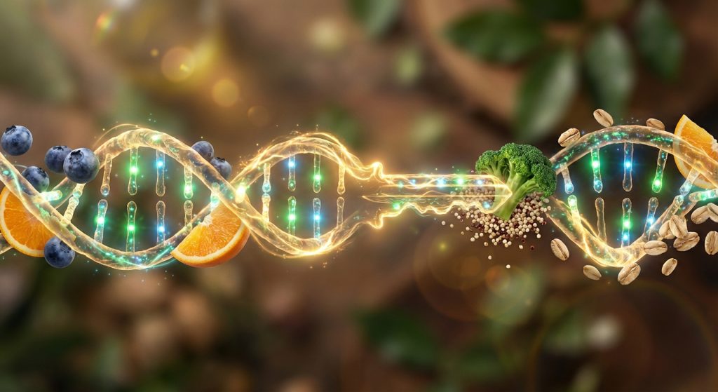 A stylized illustration of a DNA helix intertwined with vibrant fruits and vegetables, symbolizing the connection between genetics and nutrition.