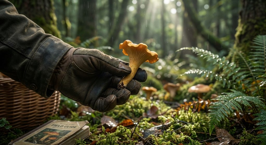 A keen forager meticulously identifies a mushroom, prioritizing knowledge and caution over haste.