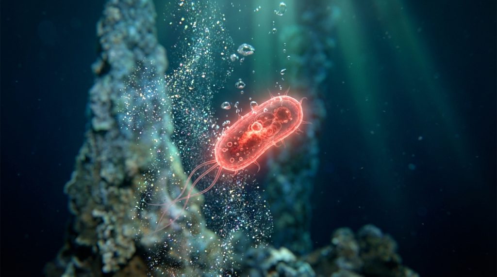 Microscopic organisms clustered around a hydrothermal vent, glowing faintly in the deep-sea darkness.