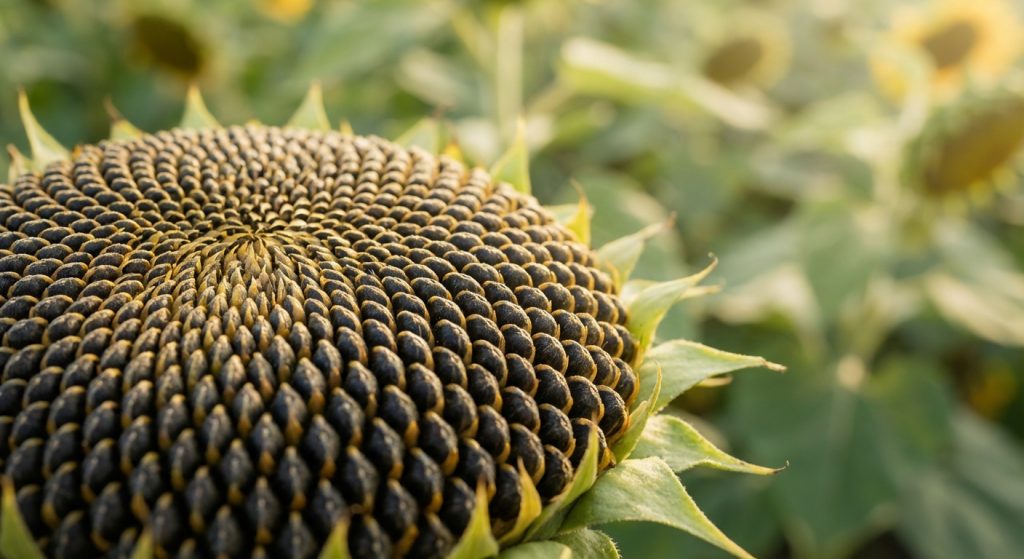 A close-up view of a sunflower’s head, revealing the intricate spiral arrangement of its seeds.