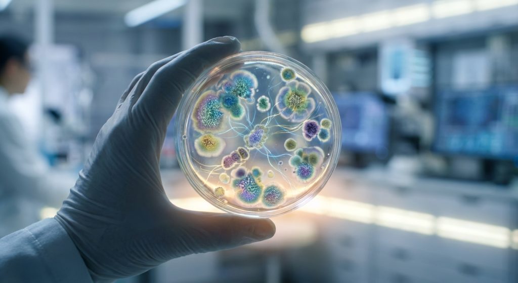 A person examining a petri dish under a microscope, symbolizing the detailed analysis of gut bacteria.