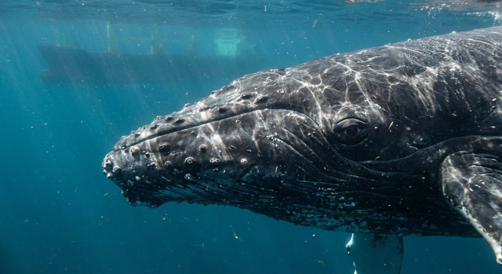 A majestic whale breaches the ocean’s surface, unaware of the distant rumble of a passing cargo ship.