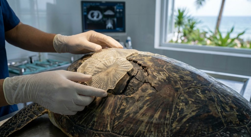 A veterinarian carefully examines a 3D-printed prosthetic piece designed to perfectly match a turtle’s damaged shell.