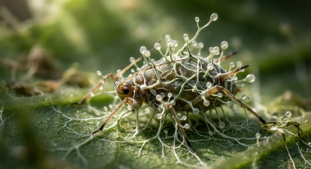 This fungus is effective against soft-bodied insects. This includes aphids and mealybugs. It attacks their nervous system. It also consumes their internal tissues. As a result, the insect stops feeding and dies. It thrives in humid conditions.