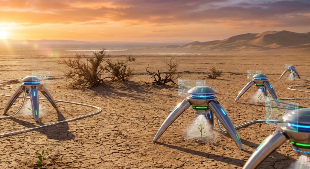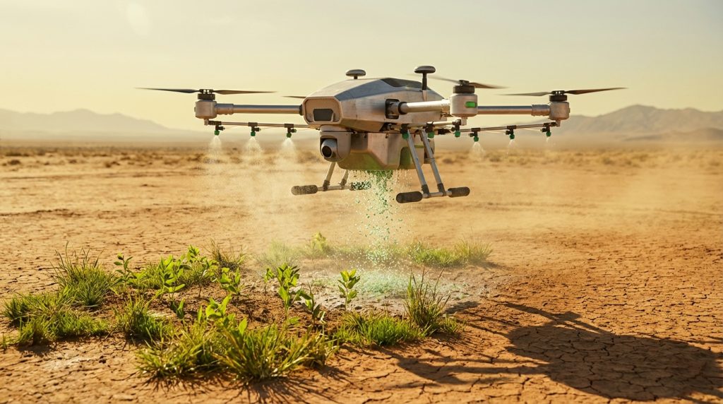 Drones meticulously plant saplings in arid soil, a testament to technology battling desertification.