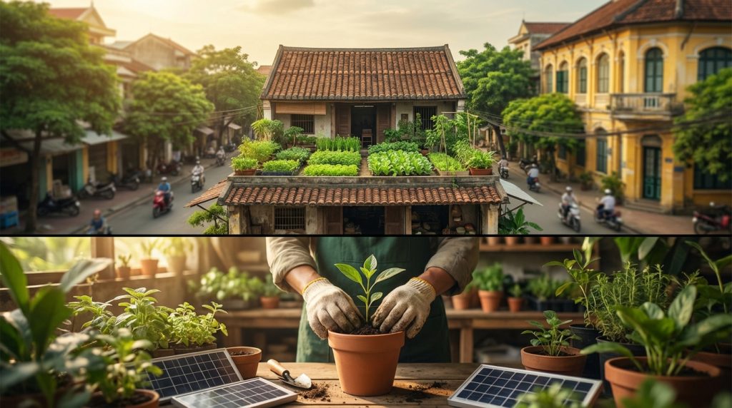 A small Vietnamese business owner carefully tending to a vibrant rooftop garden, symbolizing growth and sustainability.